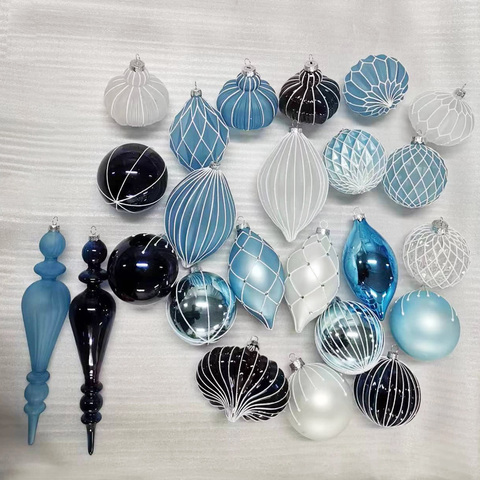 White & Blue Christmas Decoration Bauble Gift Custom Hand Painted Blown Glass Hanging Decorative Christmas Ball Crafts Set